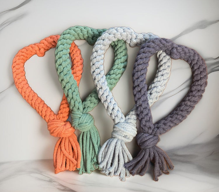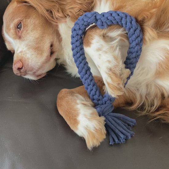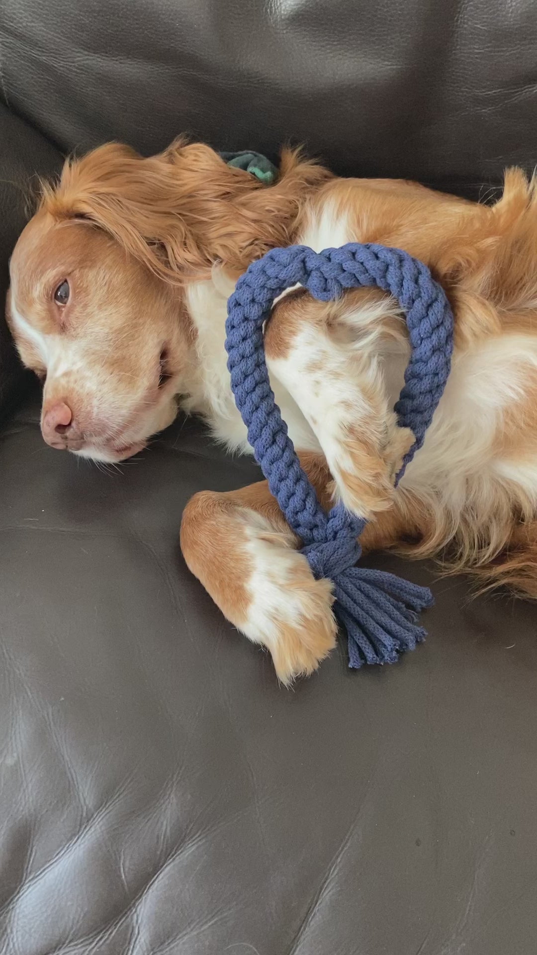 Spoil your furry friend with this adorable heart-shaped dog pull toy, perfect for playtime, tug-of-war, and cuddles! Handmade with soft yet durable cotton cord, this interactive dog toy is gentle on teeth and tough enough for tugging, making it ideal for puppies, small dogs, and large dogs alike. Also great for teething pups as can be frozen when wet. Comes in three beautiful colours, navy, teal and pink.