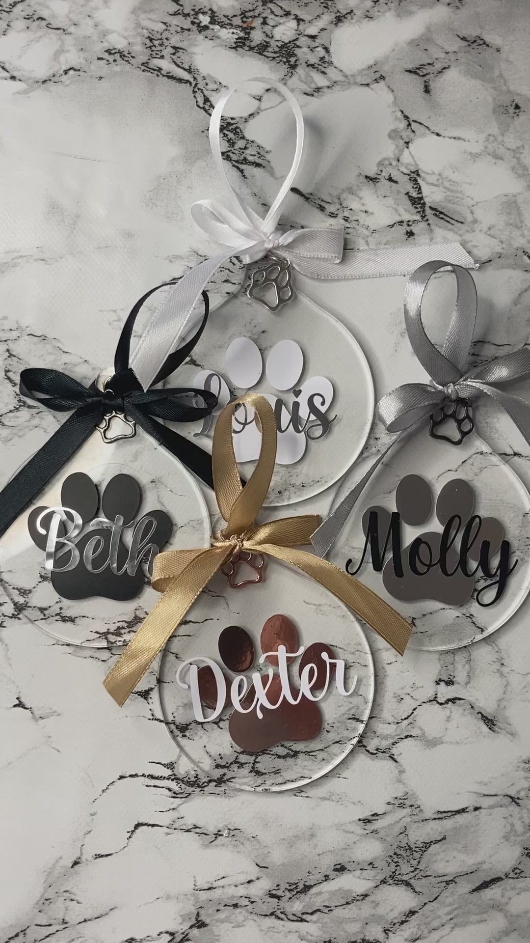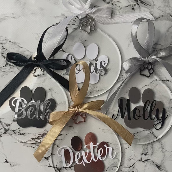 Every paw print bauble is lovingly handmade and bespoke for your dog. The item is made from a flat acrylic 8x10cm bauble and personalised for you with your dogs name over a paw print in a choice of colours to match your Christmas decorations and finished off with a white ribbon. These are a great gift for any dog lover or for a memory of a much loved dog whom has been lost.