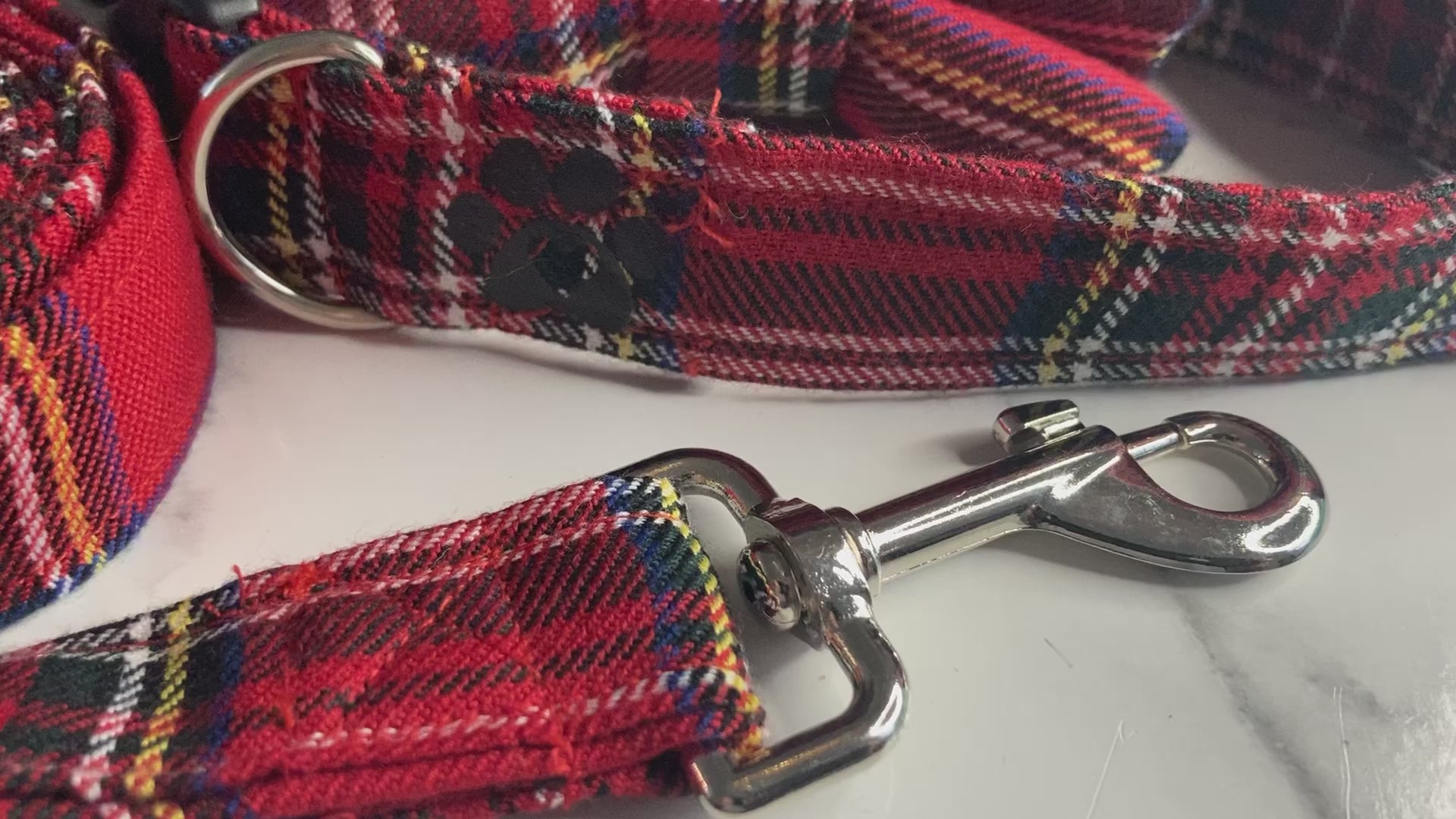 Red tartan handmade fabric dog lead made with durable webbing covered in soft cotton blend fabric. Matching accessories also available.